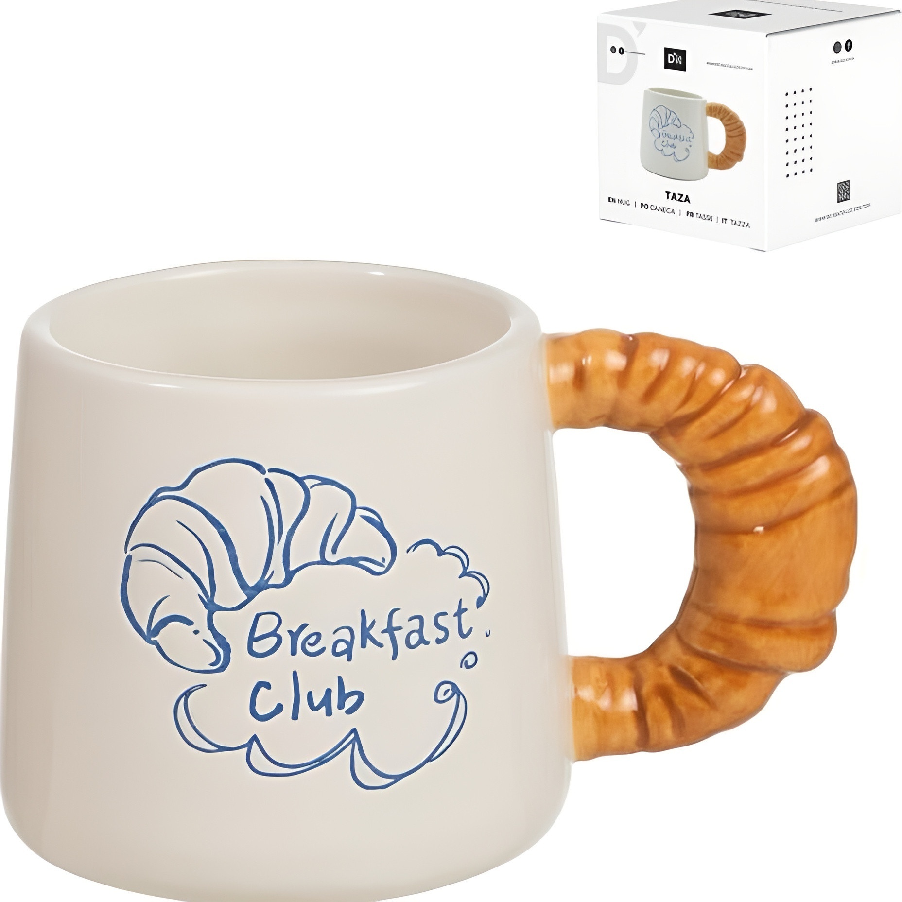 Original taza de desayuno con un asa en forma de croissant que aporta un toque divertido y diferenciado a tus mañanas. Con capacidad de 380 ml, es perfecta para café, té o chocolate. El diseño incluye una ilustración "Breakfast Club" que refuerza su estilo desenfadado y acogedor. Una pieza llamativa para tu menaje que también funciona como regalo ideal para amantes de la pastelería y el diseño casual.