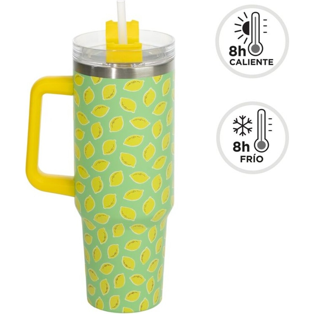 Disfruta de tus bebidas con estilo veraniego gracias a esta taza térmica con estampado de limones. Su diseño con asa y tapa con pajita facilita beber cómodamente en movimiento, mientras que su estructura de doble capa ayuda a mantener la temperatura de tus bebidas. Ideal para llevar al trabajo, la playa o en excursiones, aporta un toque fresco y colorido a tu día a día.