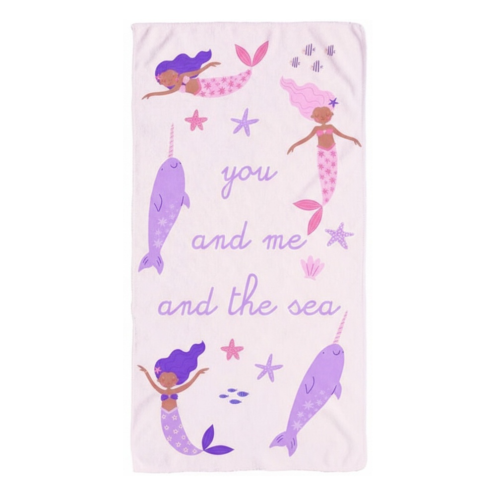 Toalla infantil con un alegre estampado de sirenas y narvales en tonos rosa y lila. Pensada para acompañar las aventuras en la playa y la piscina, aporta un toque divertido y lleno de color. Su tamaño es ideal para niños y niñas en edad escolar, y su diseño la convierte en una opción perfecta como regalo de cumpleaños.