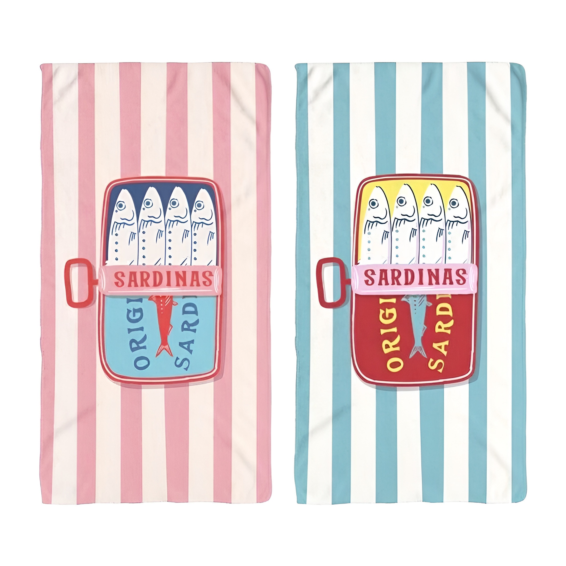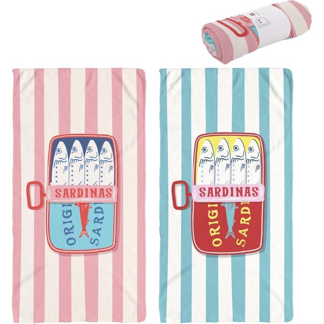 Toalla de playa con un diseño vintage inspirado en latas de sardinas, ideal para aportar un toque divertido y original a tus días de sol.