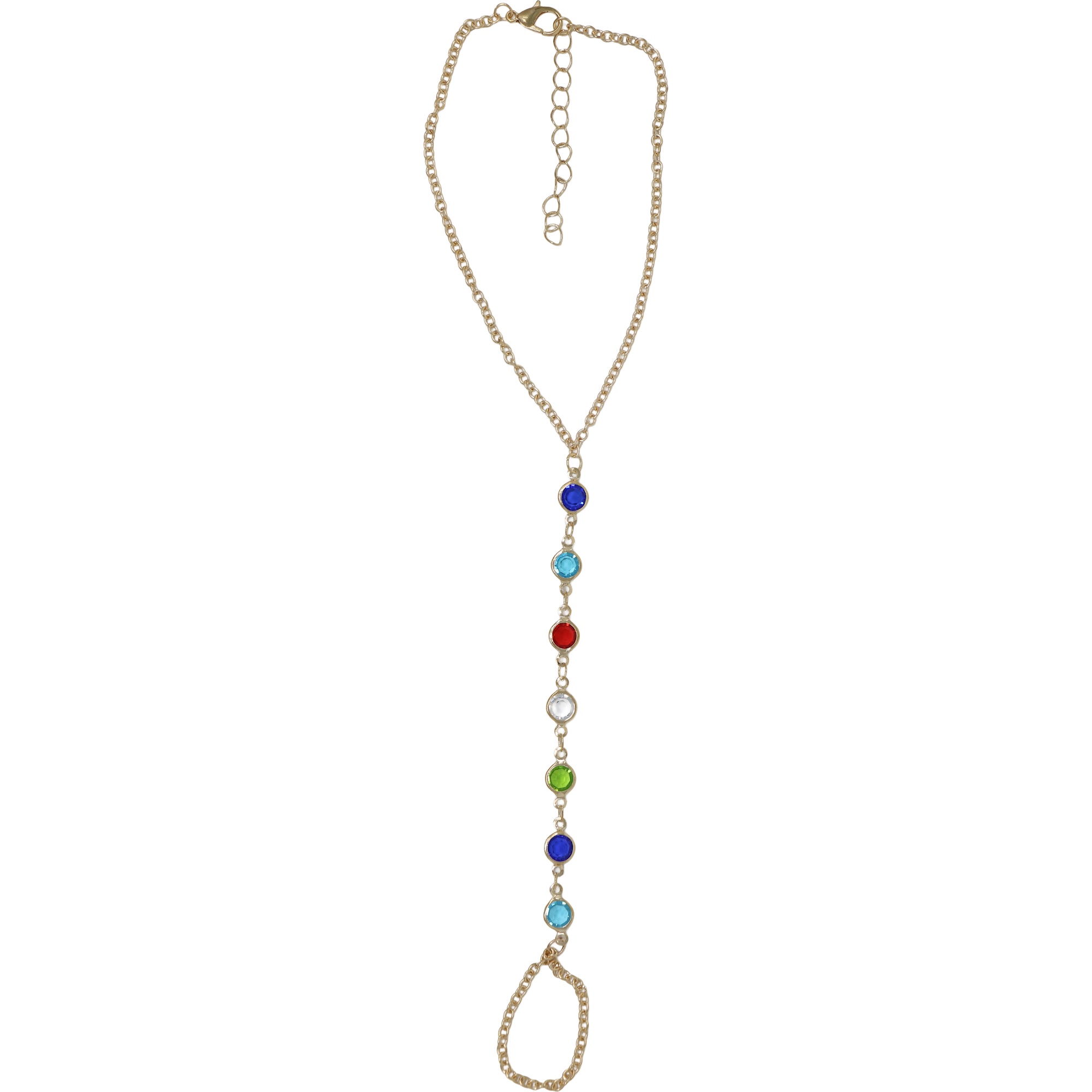 Tobillera boho con anillo y piedras de color. Diseño delicado que une una cadena al anillo para el dedo, con piedras de colores que aportan un toque veraniego y alegre. La pieza combina metal dorado con detalles en PVC para un brillo vibrante y resistencia al uso casual. Cuenta con cierre ajustable y es ligera, pensada para llevar con sandalias o descalza en la playa y en ambientes de estilo festival.