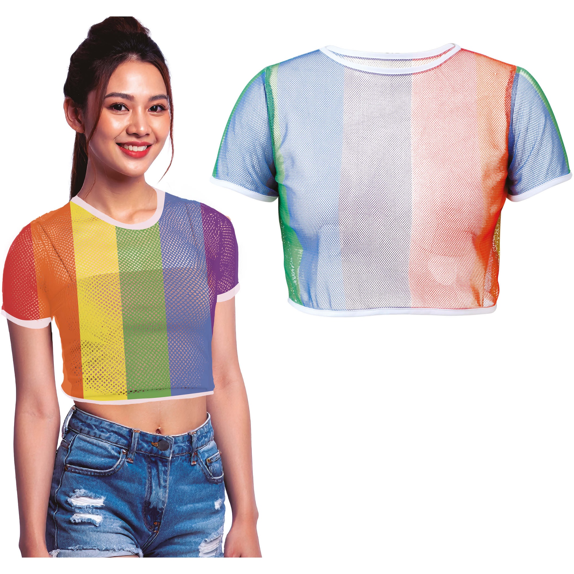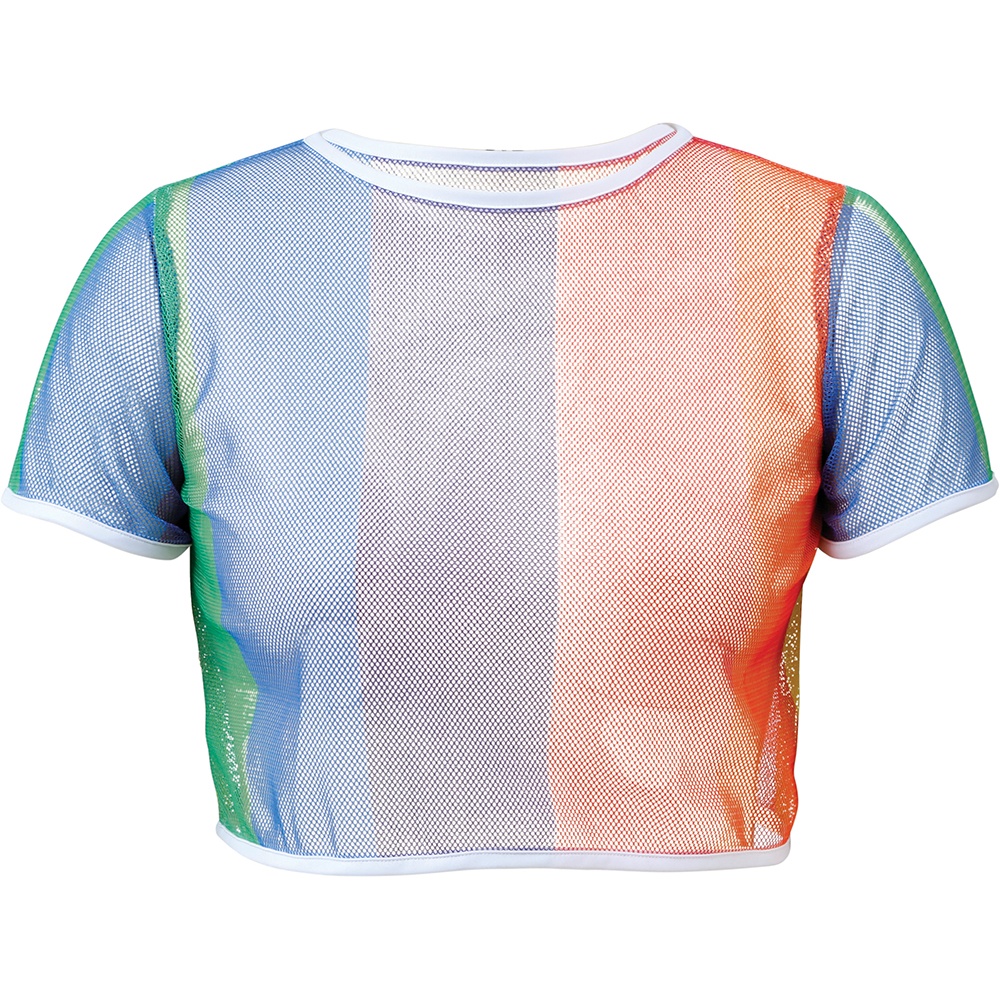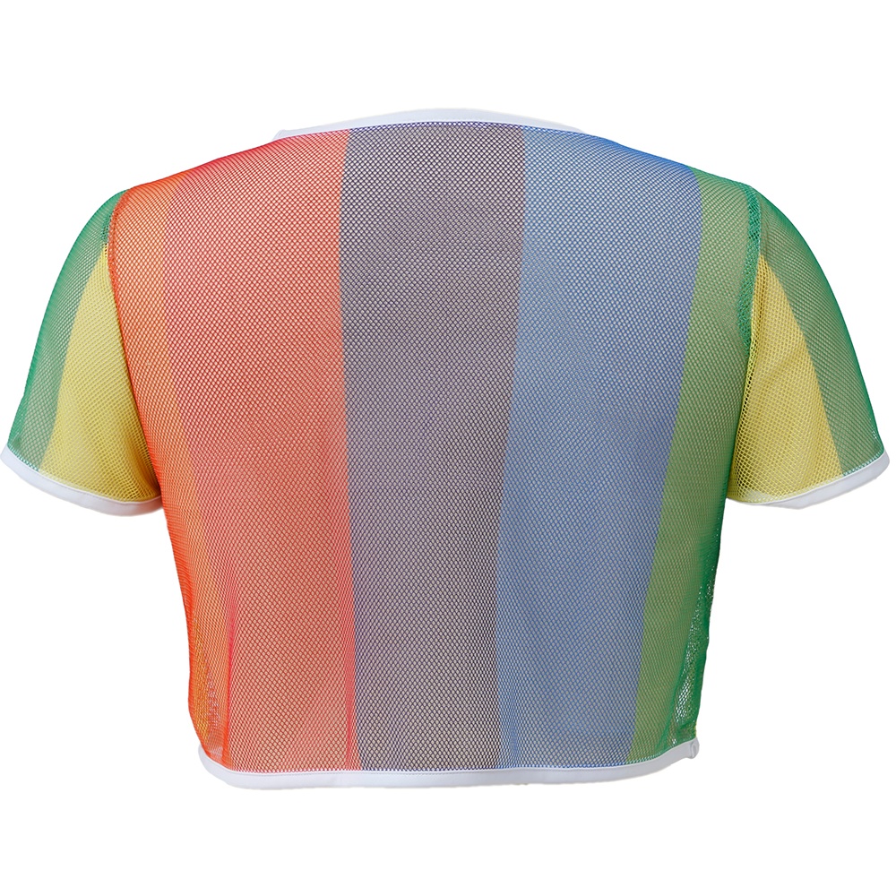 Top crop de rejilla en vivos tonos arcoíris con acabado semitransparente. Diseño ligero y transpirable en tejido de poliéster que aporta movimiento y color. Corte corto con ribetes blancos en cuello y mangas para un acabado definido y moderno. Perfecto para superponer sobre otras prendas y crear looks llamativos y versátiles. Prenda pensada para adultos que buscan un toque colorido y cómodo.
