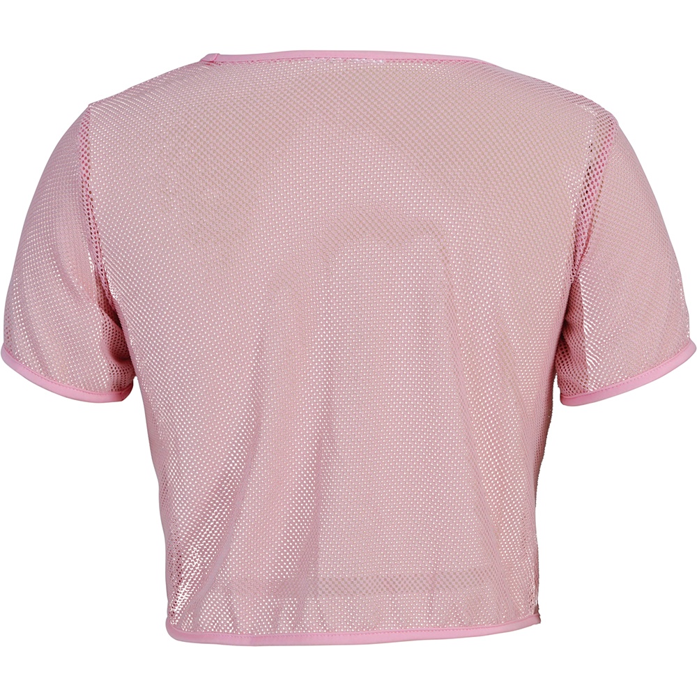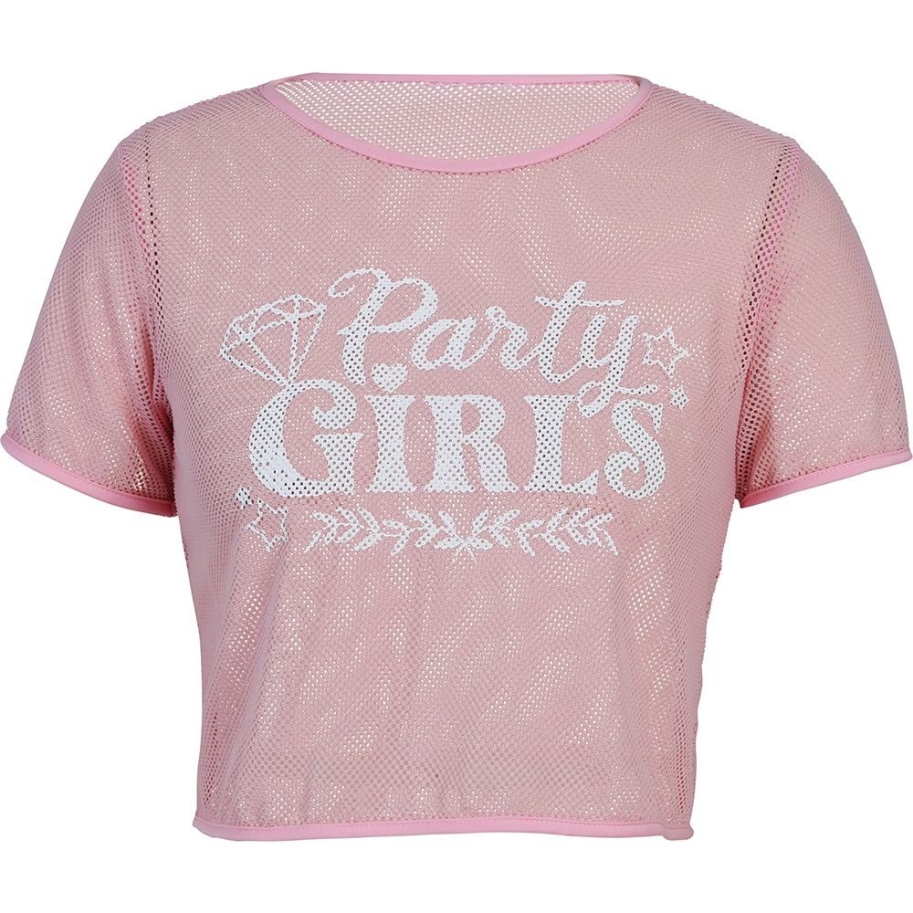 - Top crop de rejilla rosa con estampado 'Party Girls' para un look festivo y femenino.