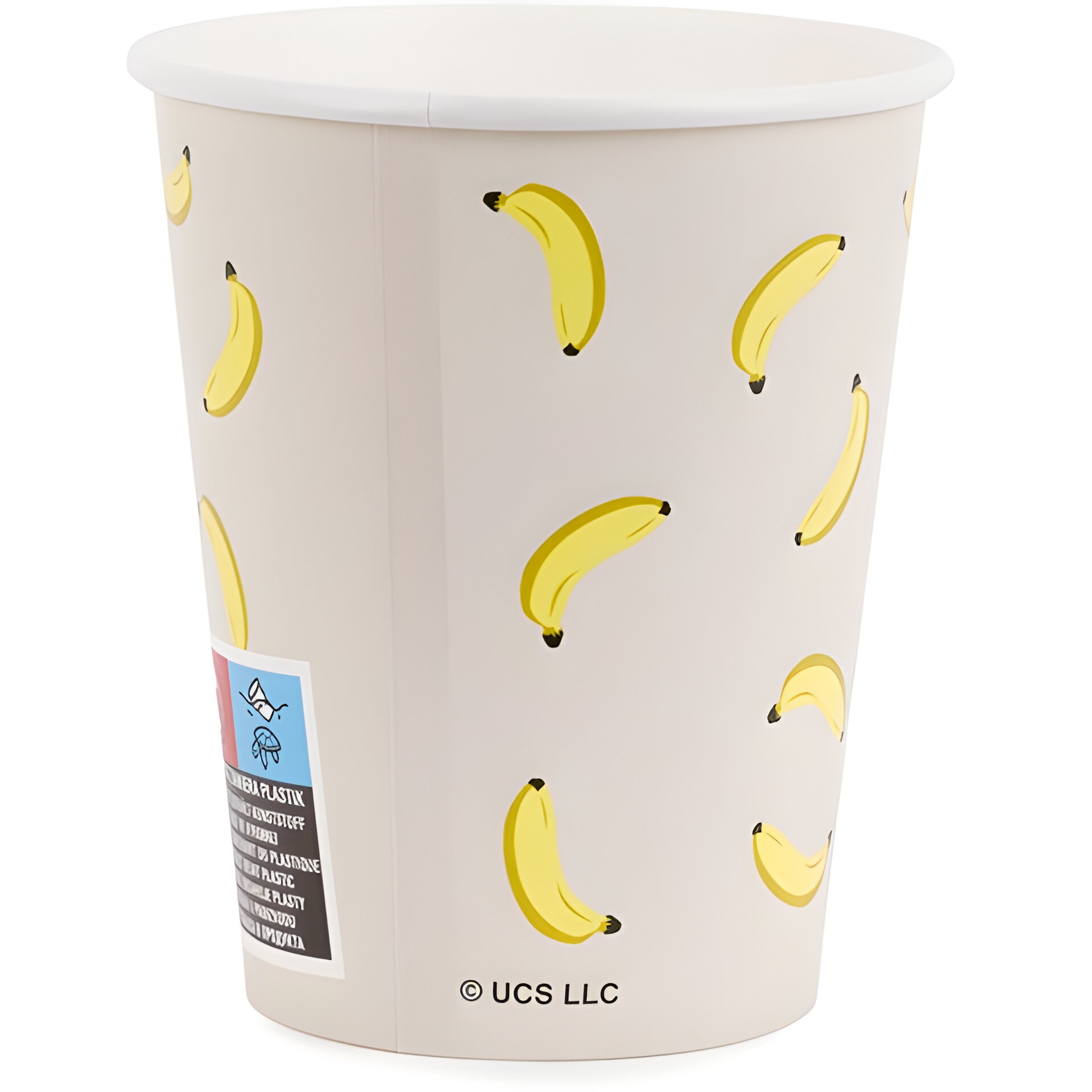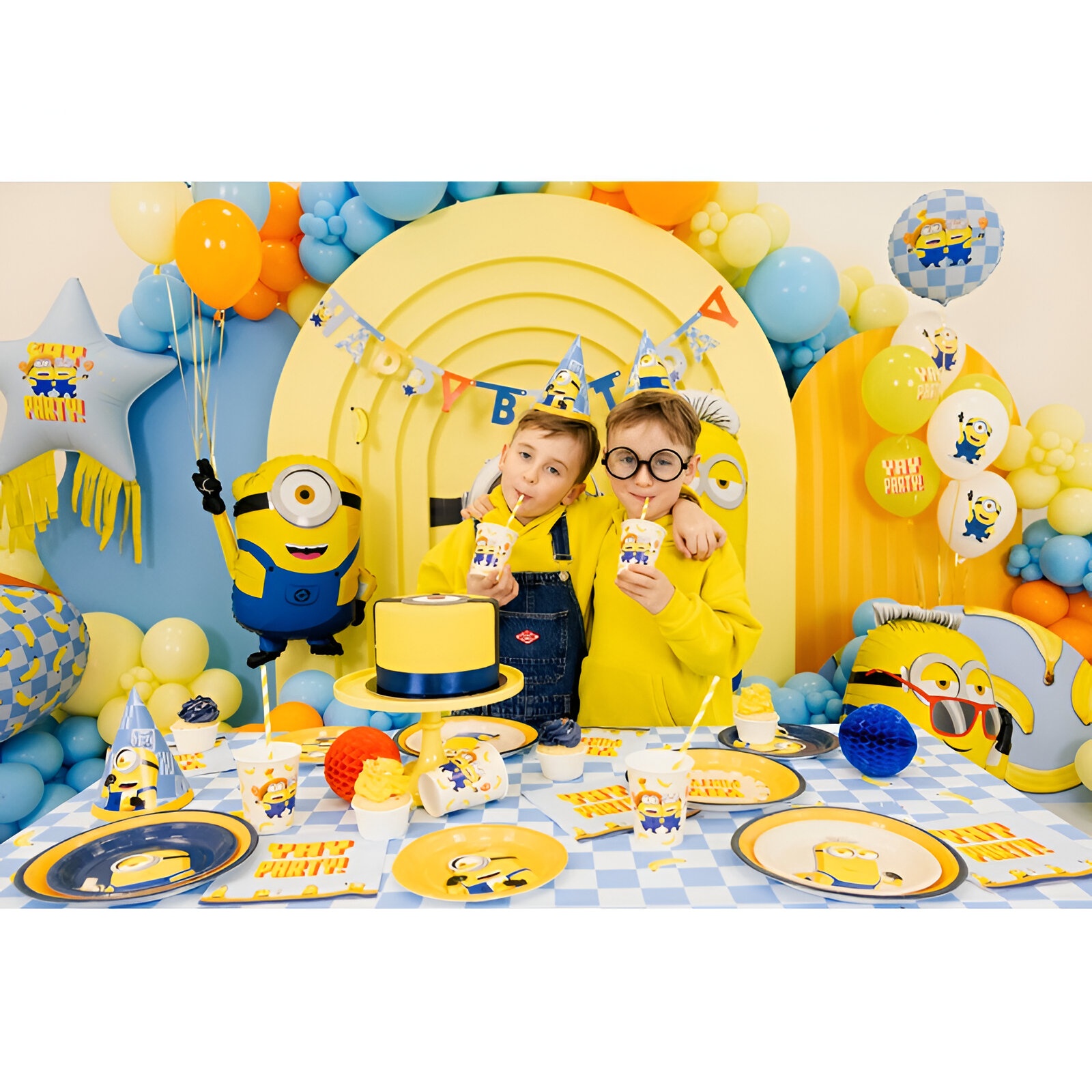 Vasos de papel con divertido estampado de Minions en tono beige, pensados para animar celebraciones infantiles. Altura aproximada 9 cm y capacidad aproximada 250 ml (8.5 oz). Producto desechable, recomendado para bebidas frías; no apto para bebidas calientes. Cumplen el etiquetado requerido por el Reglamento (UE) 2020/2151 con información en polaco, español, letón, estonio, portugués, húngaro, griego, croata y rumano. Ideales para cumpleaños, meriendas y fiestas temáticas infantiles.