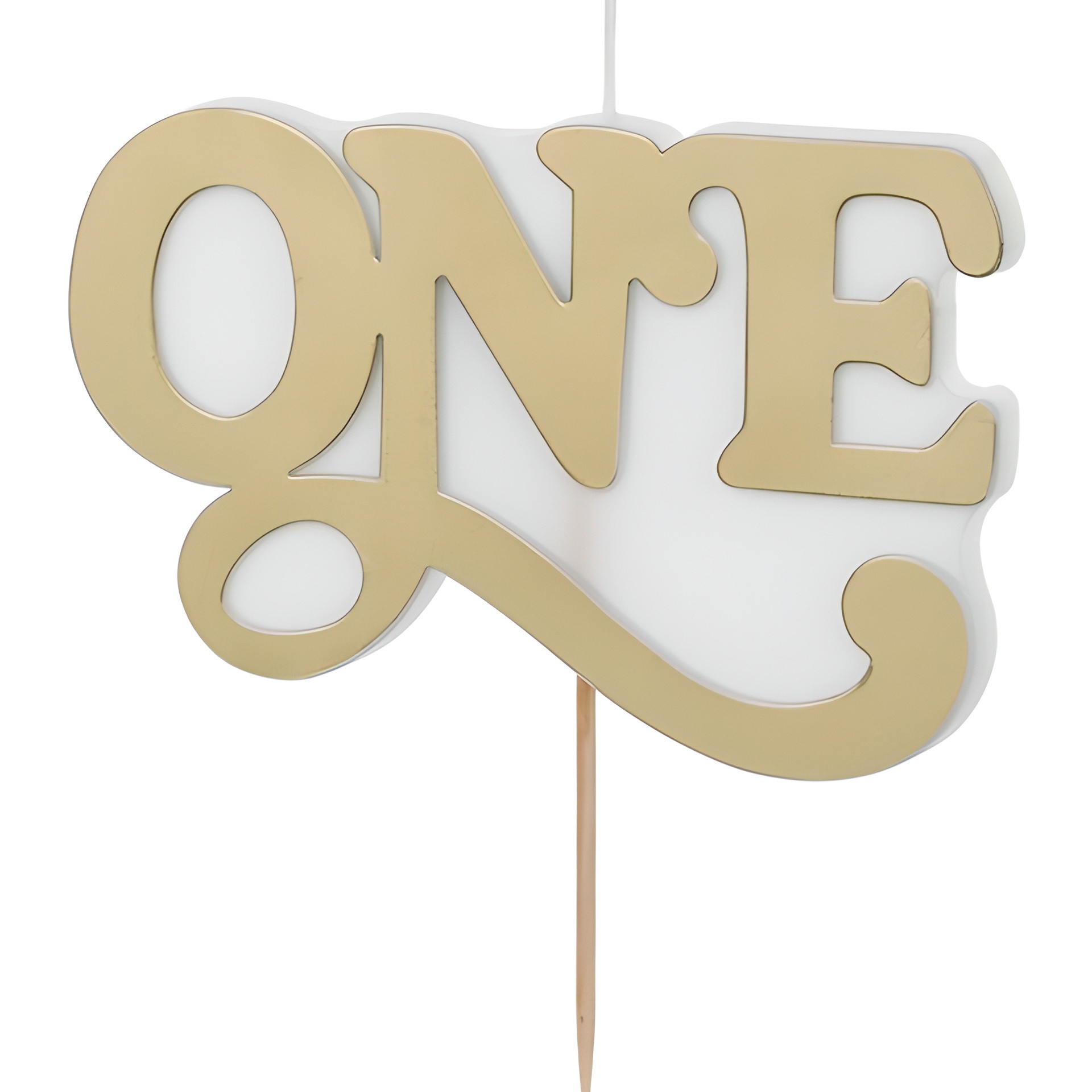 ONE en acabado oro frío para un toque elegante en la tarta del primer cumpleaños. Diseño llamativo y legible que destaca en fotos y celebraciones. Colocación sencilla gracias a su soporte de palillo integrado. Aporta un acabado festivo y sofisticado a cualquier montaje de cumpleaños.