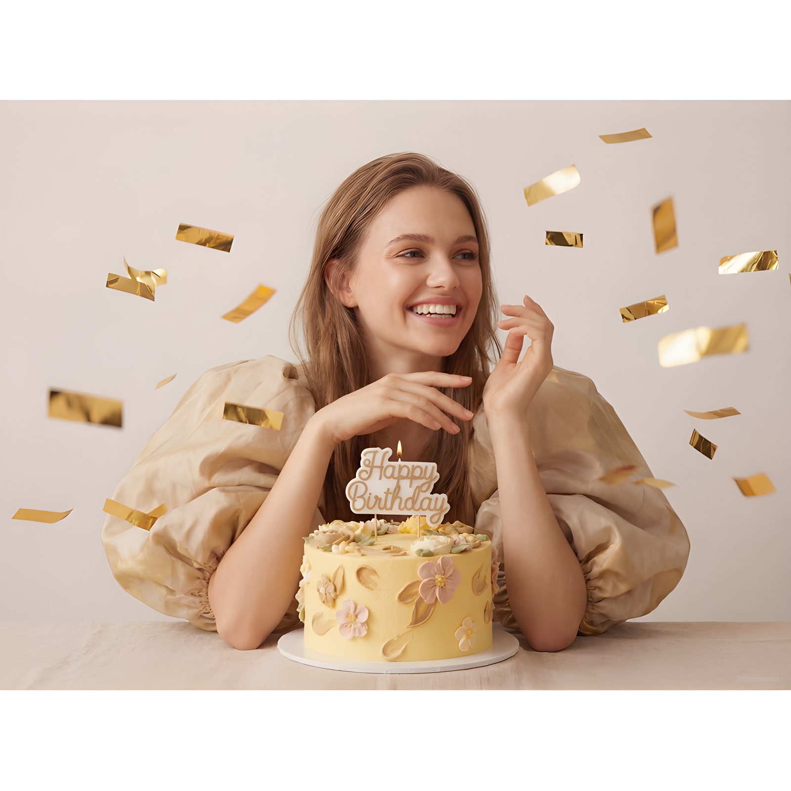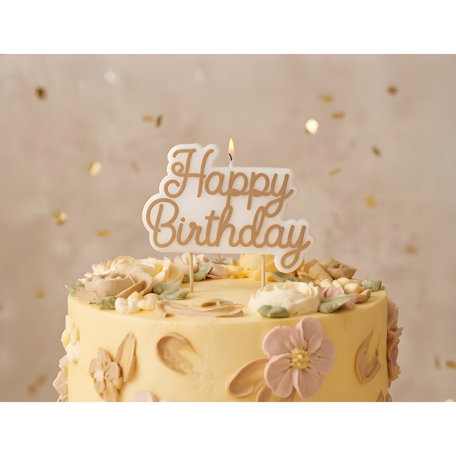 Vela topper "Happy Birthday" en dorado frío que aporta un toque sofisticado y moderno a cualquier celebración. Su tipografía cursiva y el contraste dorado sobre fondo blanco crean un acabado elegante y muy fotogénico.